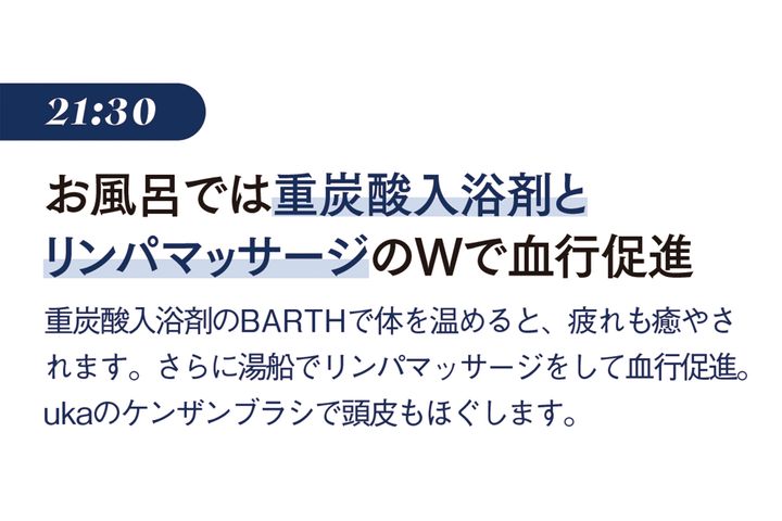 重炭酸入浴剤のBARTHで体を温めると、疲れも癒やされます。さらに湯船でリンパマッサージをして血行促進。ukaのケンザンブラシで頭皮もほぐします。