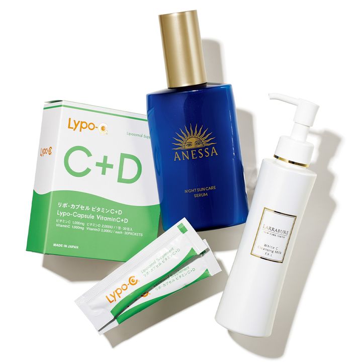 [右から]「美容液成分たっぷりなのに、油性も水性汚れも落ちるのが頼もしい」ララビュウ ホワイトニングCクレンジングミルク EX-L 150㎖ ¥3,960(潤子ララビュール) 「保湿と美白、シワ改善ができるオールインワン処方が嬉しい。疲れた日ラクちんで助かります」アネッサ スキンセラム[医薬部外品] 180㎖ ¥2,728 ※編集部調べ(資生堂)「消費されやすく吸収されにくいビタミンCを体内に留めてくれる処方。健康維持のためのビタミンDも加わって、さらに心強い!」リポ・カプセル ビタミンC+D 30包入り ¥8,964(スピック)
