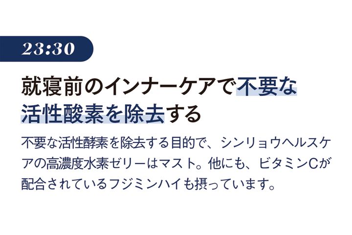 不要な活性酵素を除去する目的で、シンリョウヘルスケアの高濃度水素ゼリーはマスト。他にも、ビタミンCが配合されているフジミンハイも摂っています。