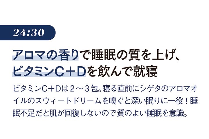 ビタミンC+Dは2〜3包。寝る直前にシゲタのアロマオイルのスウィートドリームを嗅ぐと深い眠りに一役!睡眠不足だと肌が回復しないので質のよい睡眠を意識。