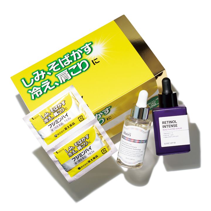 [右から]「敏感肌でも使えるデイリーレチノール。塗り終えた後の肌が、イキイキする感じがお気に入り」サムバイミー レチノールインテンスリアクティベイティングセラム 30㎖ ¥2,850(ワンダーライン)「使うたびに、透き通った明るい肌に。じわり温かくなるので、効果をより実感できる気がします」クレアス フレッシュジュースドビタミンドロップ 35㎖(私物) 「実は父が長年飲んでいるアイテム!健康的な父の肌を見て、私も今年から飲み始めました」フジミンハイ[第3類医薬品]96包入り ¥5,029(富士薬品)※個人の感想です