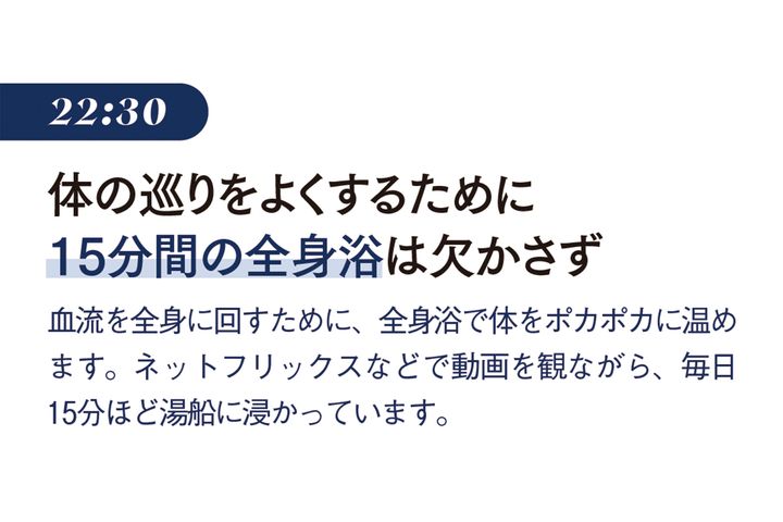 血流を全身に回すために、全身浴で体をポカポカに温めます。ネットフリックスなどで動画を観ながら、毎日15分ほど湯船に浸かっています。