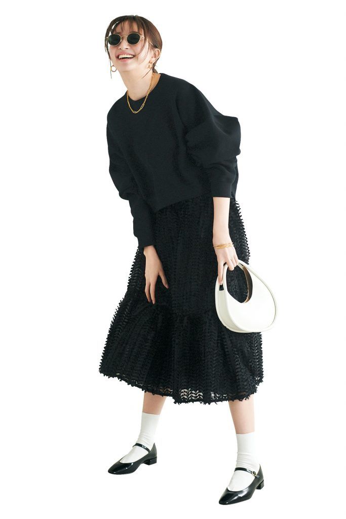 スウェットやミモレスカートで異素材MIXをした、センス溢れるモノトーンコーデ。白ソックス×メリージェーンの可愛げな足元にすれば、抜け感が生まれ、親しみやすい印象に。ピアス、ネックレス、ブレスレットにゴールドを散りばめ、モダンな華やぎを添えて。