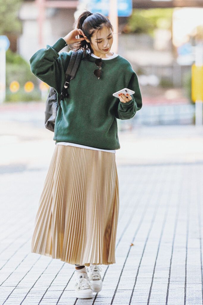 華やぎを演出するプリーツスカートは、スウェット×スニーカーでカジュアルに転ばせるのが今の気分。いつもならタイツのところをラインソックスを差し込むだけで、こなれた表情にシフトします。スニーカーにつながる白ベースなら浮き過ぎず、程よいアクセントに。