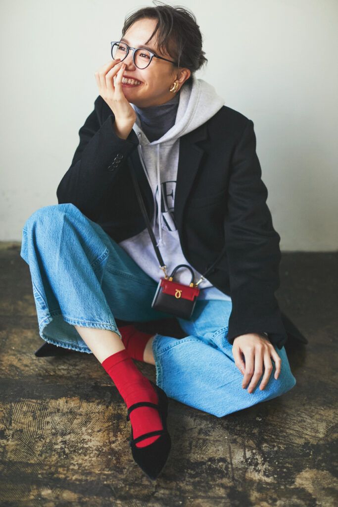 ブルーデニムにフーディというスタンダードな組み合わせは、今季トレンドの赤でブラッシュアップさせるが吉。ヒロインカラーのため、足元に少量取り入れるだけで、しっかりと可愛げを発揮してくれます。メリージェーンとの組み合わせで、どこかパリシックに。