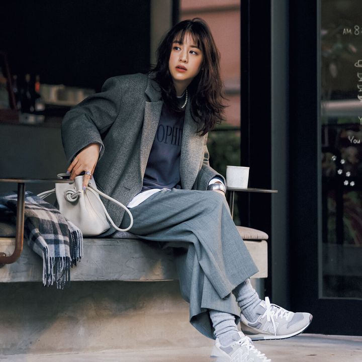 今季トレンドのグレーコーデを味変するなら?パンツ&スニーカーと同色のグレーソックスで繋ぐのが正解です。悪目立ちせず、潔いワントーンでまとめることでトレンドムードを底上げ。手持ちアイテムがソックスひとつでグッと見違えます。