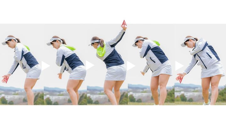 右手のひらとフェース面はほぼ同じ向きになるため、この右手の動きができるとフェース面を開かずにスイングでき、ミート率が上がります。バックスイングと同時に右手のひらを正面に向けると、実際のスイングではフェース面が開いてしまうので気をつけましょう。一度フェースを開いてしまうと、インパクトではスクエアに戻しにくくなるのでミート率は下がり、飛距離も落ちます。さらに、弾道を高くしたければ、アッパー軌道でクラブを振り抜きましょう。