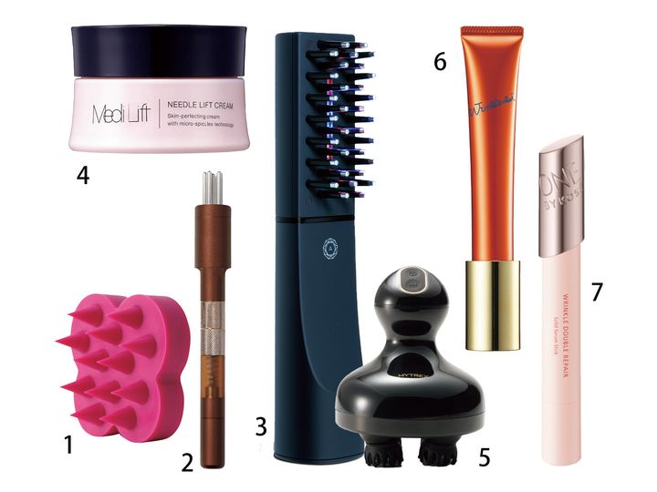 1. スカルプブラシケンザンソフト¥2,420(uka)2. Face-Pointer D-Pro ¥21,800(コアフィット)3. デンキバリブラシ®20(専用ローションとセット販売)¥179,300( GM コーポレーション)4. メディリフト ニードルリフトクリーム 25g ¥7,700(ヤーマン)5. 電気針ヘッドスパ® MYTREX EMS HEAD SPA ¥12,760(マイトレックス)6. リンクルショット メディカル セラムN 20g ¥14,850(ポーラ)7. ONE BY KOSE リンクル ダブル リペア4g ¥2,970(コーセー)