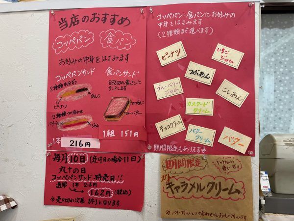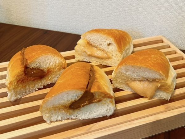 中身は注文してから店員さんがコッペパンにはさんでくれます。食パンを購入しても中身をはさんでくれるのは嬉しいです。中身は2種類まで選べ、迷ったときの「期間限定」キャラメルクリームと大好きなピーナッツにしました。 コッペパンはそのままの形状のプレーンだけでも購入できます。