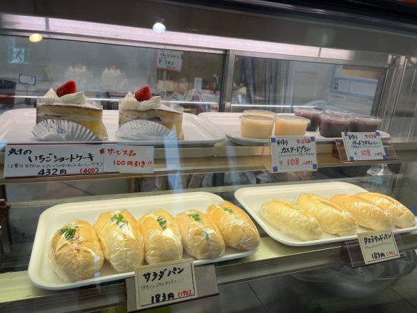 いちごのショートケーキもありました。この日はサービスで100円引き‼ほかにもカスタードプリンや水ようかん、ロールケーキやカップケーキなどスウィーツも充実しています。それにどれも買いやすいお値段です。