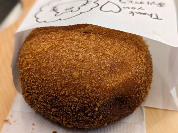 可愛らしい袋から取り出すと、揚げたてのまん丸いカレーパンが出てきました。