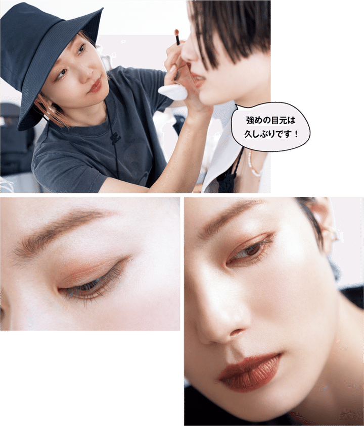 「お洋服が重たくなるシーズンだからこそ、ベースはツヤ感を出して軽く見えるよう、ウォータリーな下地とスティック状の美容液を仕込んでからファンデをオン。目の下には肌より明るいトーンコンシーラーをのせて、メリハリをつけています」