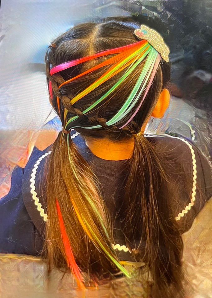 このお子さんのママさんにヘアの詳細を聞いたら、このレインボーエクステはこの雲??のパッチンどめに予めついていてそれを編み込んでるらしい…!!!