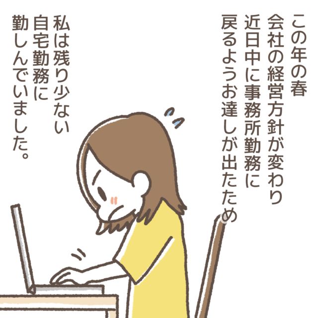 春になり、赤井ふみさんの勤めている会社の方針が変わり、自宅勤務から事務所勤務に戻るようお達しが出ました。
