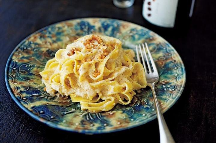 フライパンに③を入れて中火にかけ、ペーストが溶けてとろりとしたら、②のフェットチーネを湯をきらずにフライパンに直接加え、強火にしてしっかり炒め合わせる。味をみて足りないようならゆで汁を大さじ1~2加えて混ぜ、さらに味をみて足りなければ塩でととのえる。器に盛り、①のくるみを砕いて散らす。
