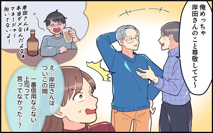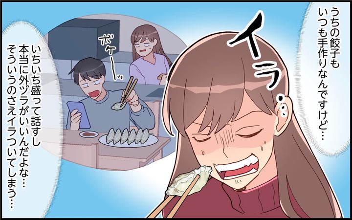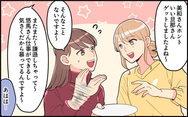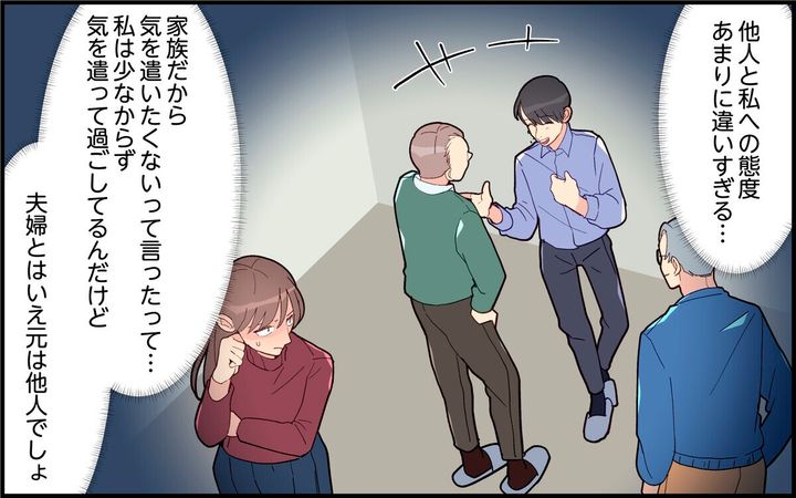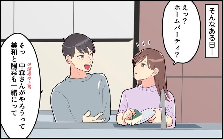 ある日、夫が会社の人とのホームパーティに誘われます。予定をすぐ変更する夫を信用していない美和は、半信半疑で承諾。当日の夫を見ると、話を盛り上げるために話を盛ったり、出されたご飯を褒めたり、家では悪口を言っていた上司に「尊敬している」と伝えたり…。美和は、周りの人に気遣いを見せる様子を目の当たりにしたのでした…。
