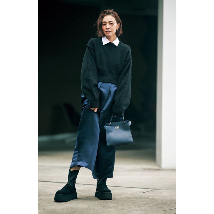 大人の黒紺コーデは スカートの艶感で上品に華やぐ。 厚底の黒ブーツで今どきバランスに