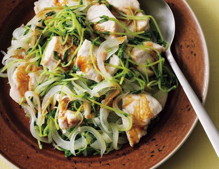 フライパンに玉ねぎ、豆苗を順に広げ入れ、(1)の鶏肉をのせて中火にかける。酒、水各大さじ2を順に回し入れ、煮立ったら弱めの中火にし、ふたをして3分蒸す。全体を混ぜ合わせ、ふたをしてさらに1分ほど蒸す。器に盛り、〈A〉をかける。