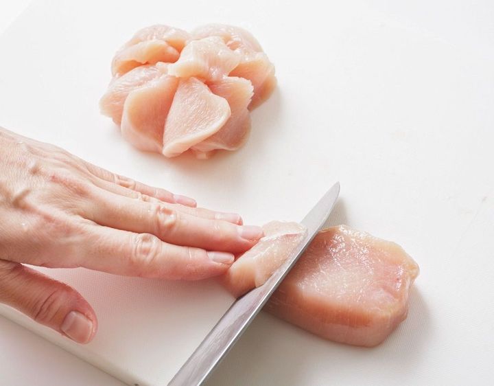 鶏胸肉は繊維を断つように、包丁を斜めに入れてそぎ切りにすると、ある程度厚みがあっても柔らかく蒸し上がります。