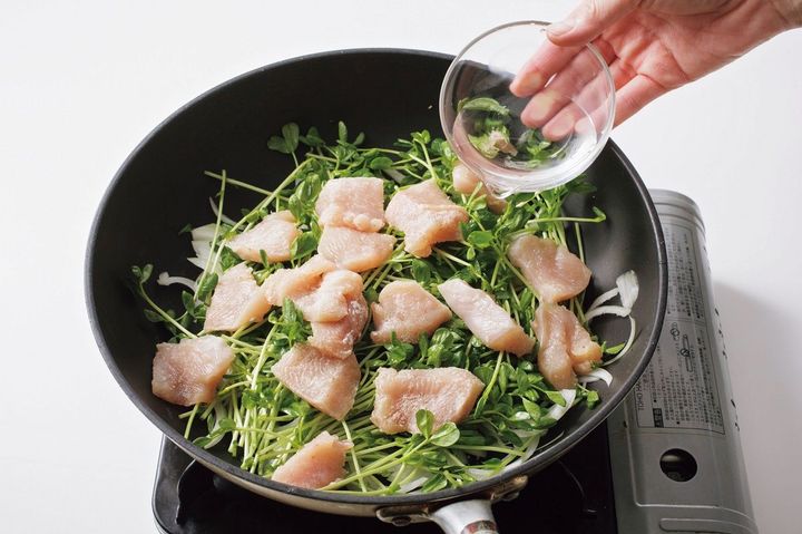 価格が安定している鶏胸肉と豆苗は、節約料理の頼れる味方ですよね。この2つを使って、フライパンに材料を並べて蒸すだけの簡単おかずをご紹介。