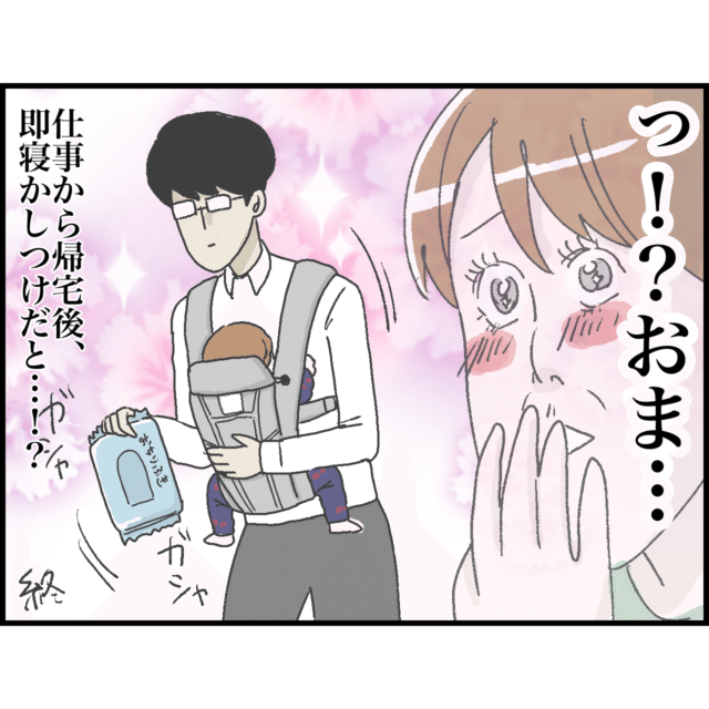 見ると、仕事から帰宅したばかりのご主人が着替えも後回しにして抱っこ紐で娘ちゃんをあやしながら寝かしつけをしているではありませんか!!
