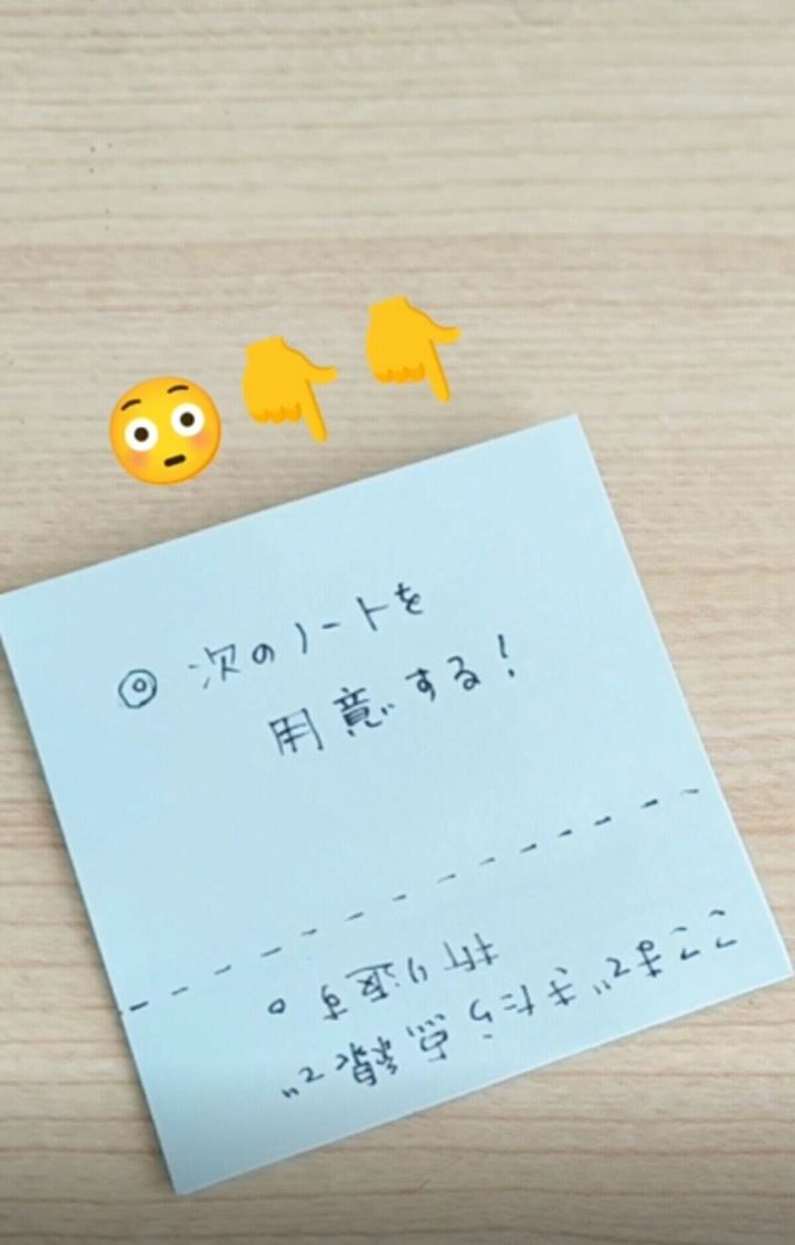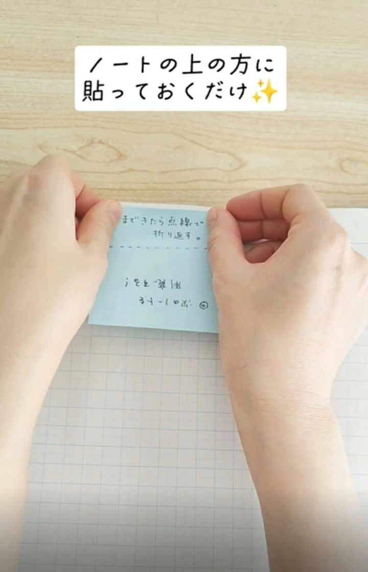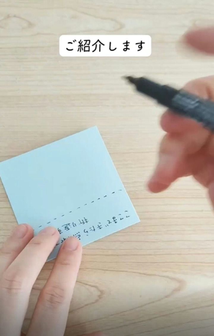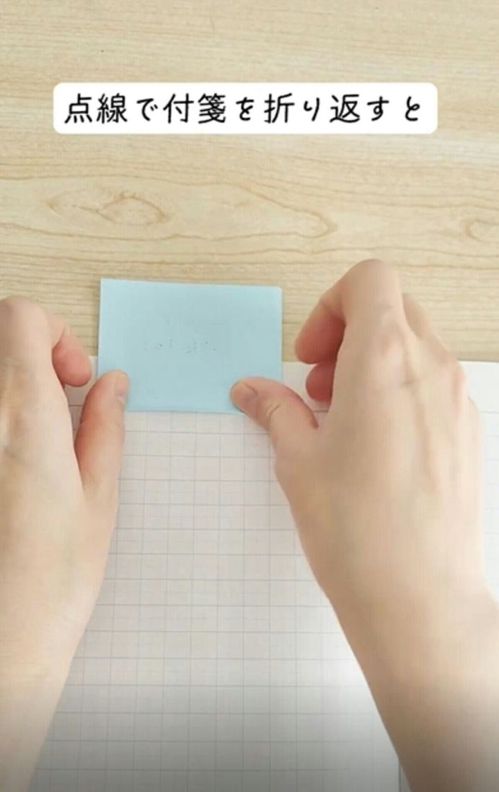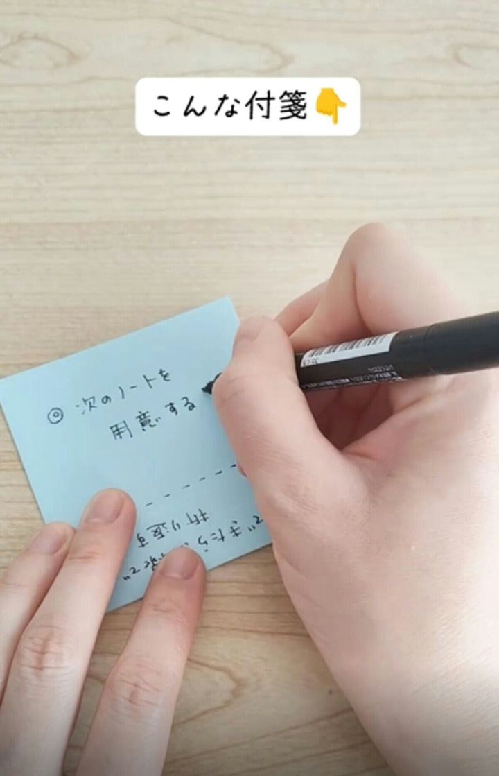 その付箋には、上の部分には『次のノートを用意する』と書き、下の部分には上下反対にして『ここまで来たら点線で折り返す』と記入しましょう。さらに付箋の3分の1のラインに点線を書いておきます。