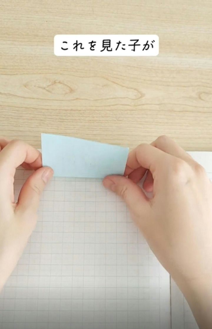 ノートが終わりに差し掛かったころ、このメモを見つけた子どもが点線で付箋を折り返すと、付箋がノートから飛び出します。