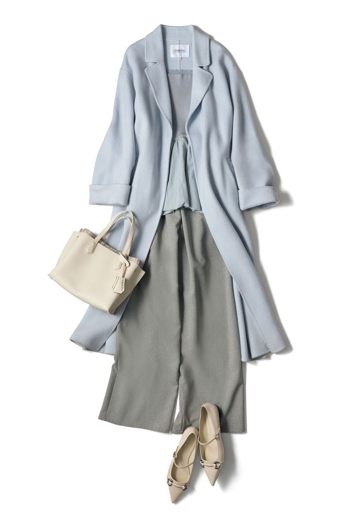 サックスブルーのコートが、デートコーデに欲しい特別な華やぎを放つ主役に。くすみ感のある色出しなので、グレーを掛け合わせてもワントーン風にまとまります♪