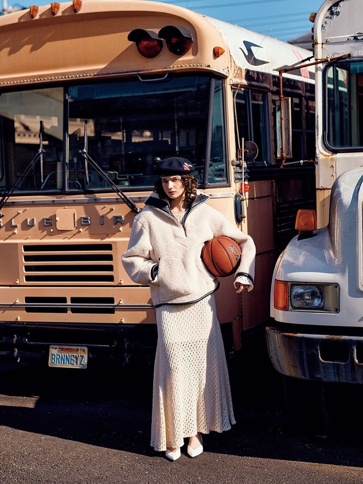 白ハーフジップボアアウター 38,500円/NKNIT 白メッシュワンピース 31,900円/STUNNING LURE(スタニングルアー 新宿店) 黒ベレー帽 5,500円/SLY(バロックジャパンリミテッド) 帽子につけたピンズ 各500円/Long Beach OMOTESANDO ゴールドスターリング 16,500円/アビステ 白パンプス 35,200円/PIPPICHIC(ベイジュ)