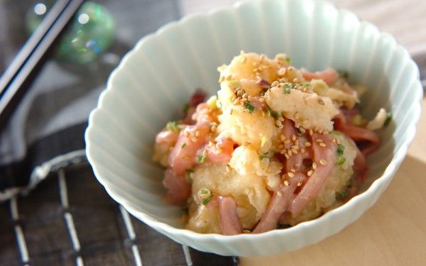 ジャガイモ×塩辛の魅惑のコラボ! ちょっぴりワサビを効かせて、大人味の和風ポテトサラダに。塩辛の塩味とコクがたまりません。ついつい箸が止まらなくなりますよ。キンと冷えた日本酒にもってこいです。