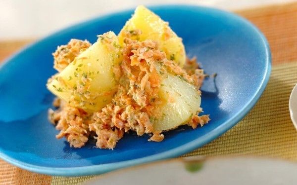 ジャガイモ×鮭フレークでしっかり味のおかずに。淡白なジャガイモに鮭の塩気が絶妙にマッチします。ジャガイモをレンジで加熱したら和えるだけなので、忙しい朝でも楽々です。