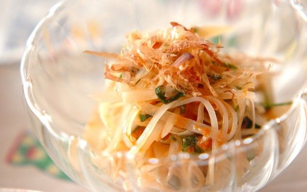 せん切りにしたジャガイモを熱湯でサッと茹でるのがポイント。独特のシャキシャキとした歯ごたえを楽しめます。大葉と梅ドレッシングを合わせて、さっぱりといただきましょう。食欲のない日や箸休めにも◎です。