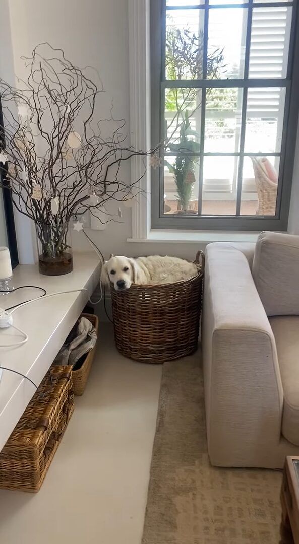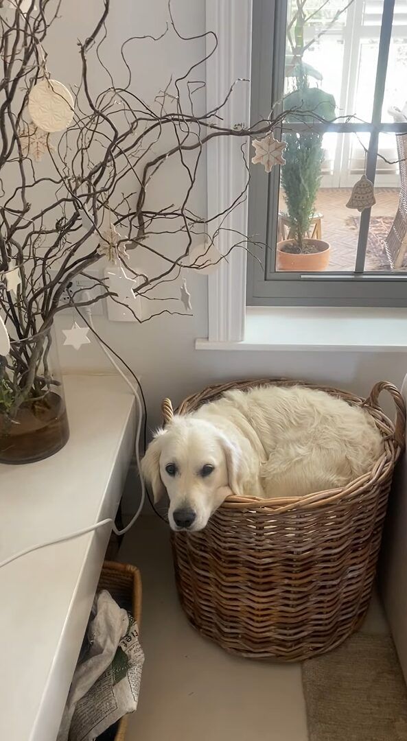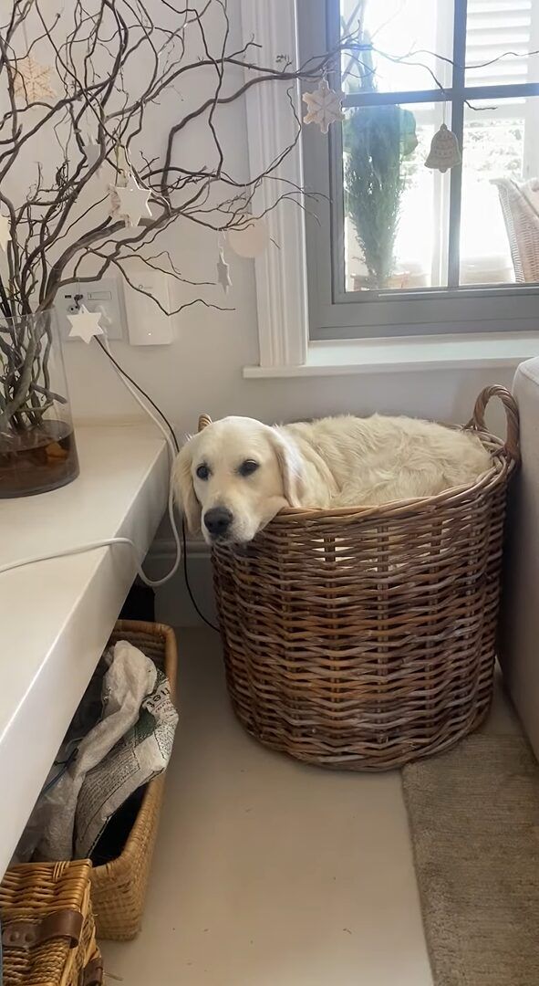 大きな体をしたゴールデンレトリバーは、窓辺でまったり過ごしている様子。 ベッドに入っているようにも見えたその場所は・・・大きなバスケットの中ですよ!?