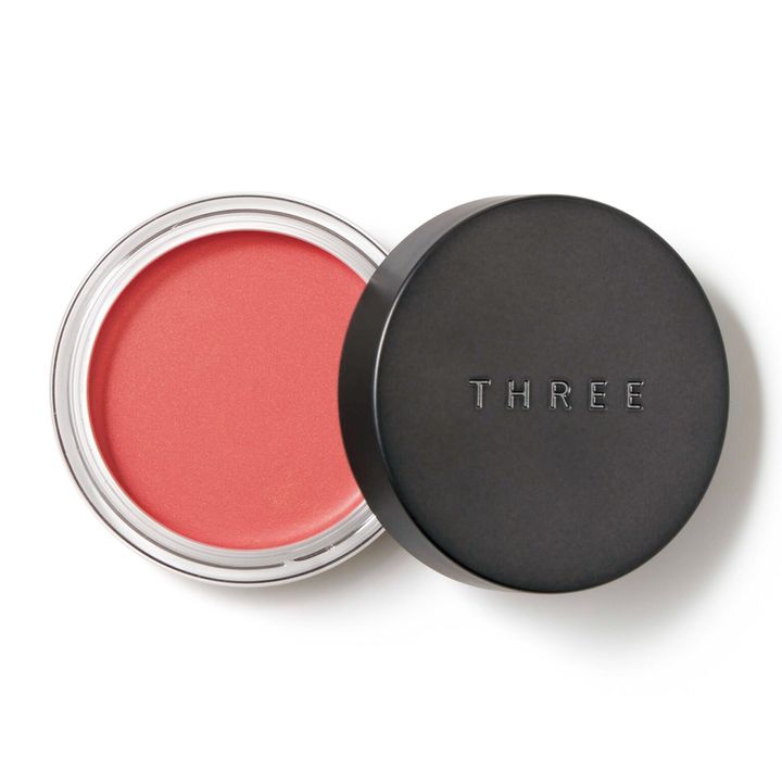 「千吉良流定番テク。練りチークを手持ちのファンデに混ぜてつけると、テクスチャーが揃って肌に馴染み、素肌のような血色感に」。¥3,300(THREE)