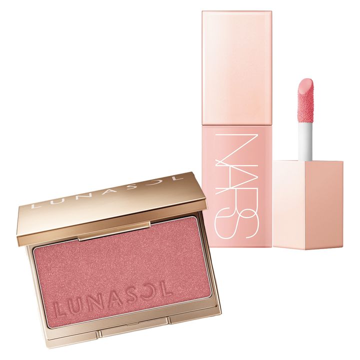 「リキッドのチークを頰の中央に軽く仕込み、その周りにパウダーチークをのせるとより自然に」。左:¥3,850〈セット価格〉(カネボウ化粧品)、右:¥4,620( NARS JAPAN)