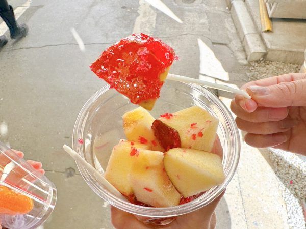りんご飴は「満たん(800円)」、「ハーフ(600円)」とサイズを選ぶことができました。旦過市場にはいろんな美味しいグルメが満載なので、ここはハーフで。 ハーフといえ大きめのカップには結構な量のりんご飴が入っていてなんだかお得です♪