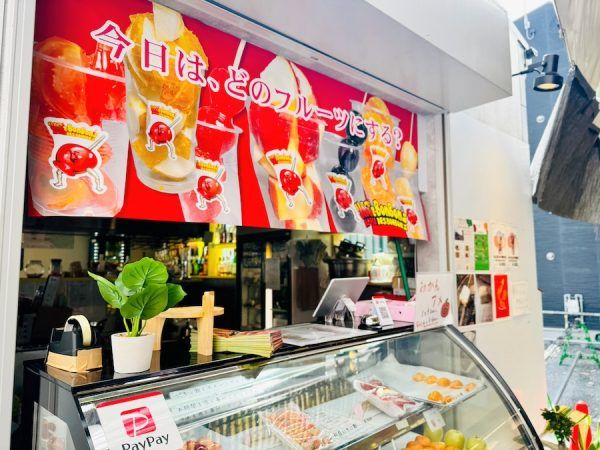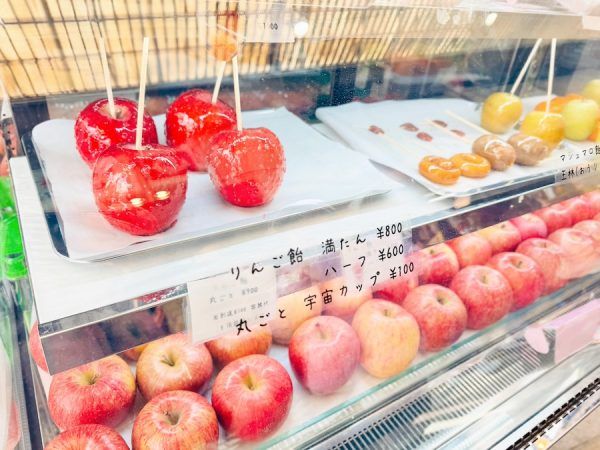 「今日はどのフルーツにする?」と書かれたのれんにはりんごだけでなくぶどうやみかんなどのフルーツが。そうなんです、りんごがメインですがそのほかにもさまざまなフルーツ飴が販売されているんです!