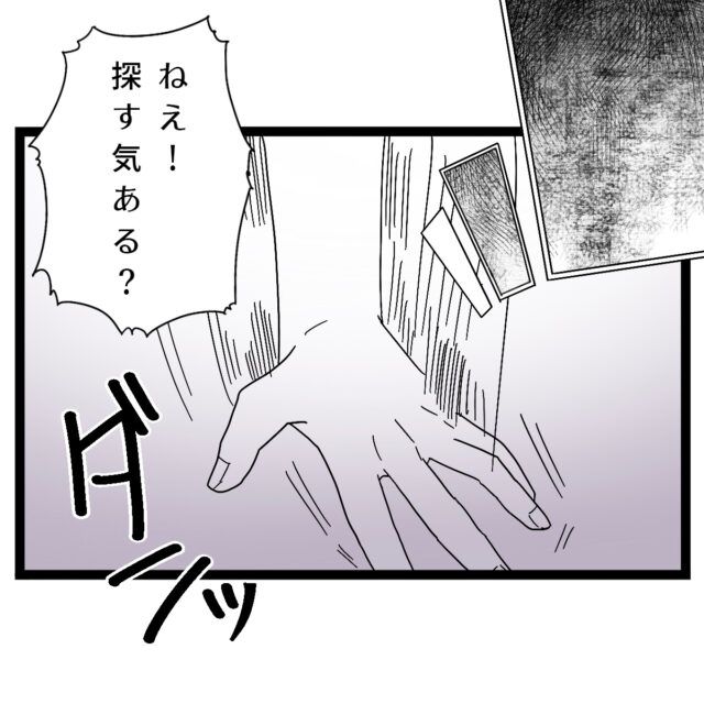 「ねえ!探す気ある?」つい声を荒げてしまいます。