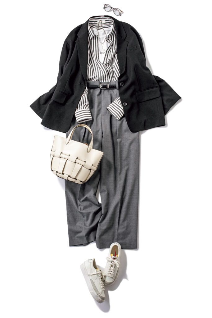 白黒の服をなじませてくれるグレーで投入。ストレートシルエットのワイドパンツはスタイルアップを叶えてきちんと見えも担保。¥22,000(プラージュ/プラージュ代官山店)