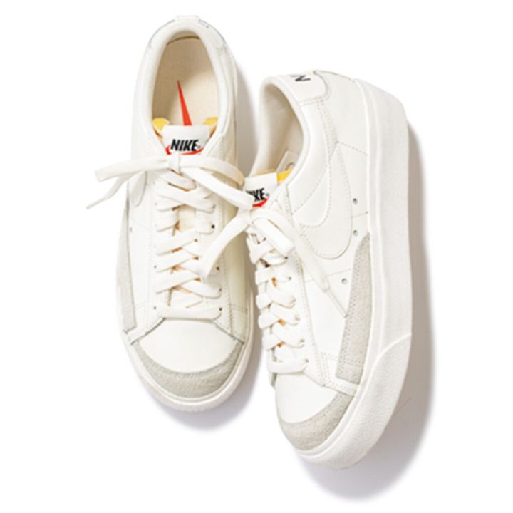 スニーカーは清潔感のある白で。「ブレーザーLOWプラットフォーム」は高さのあるソールで脚長効果をゲット。¥13,530(ナイキ スポーツウェア/NIKE カスタマーサービス)