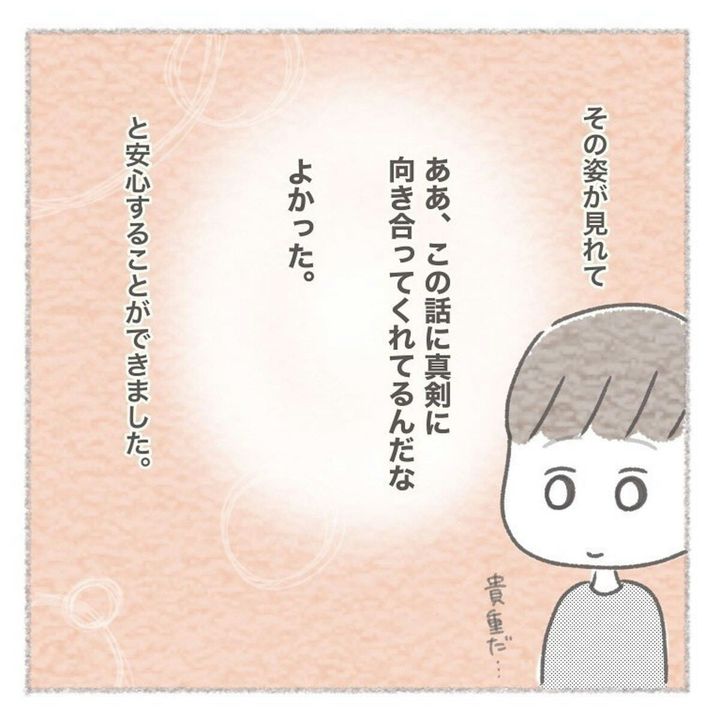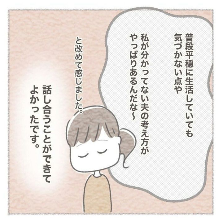 作者のペンコさんは、話し合いを通して夫の普段とは違う様子を見ることで「真剣に向き合ってくれている」「話し合いができてよかった」と安心した様子を描いています。