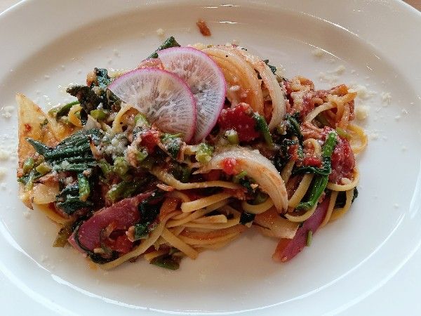 畑はプレートの中、つまりお料理の中に畑が見える。そういう意味なんだそう‼たしかに私のプレートにも美味しく作られた野菜がふんだんにあったし、パスタにもご覧の通り色鮮やかにたくさんの野菜達がまるで早く食べて~と言わんばかりに微笑んでいるではないですか‼