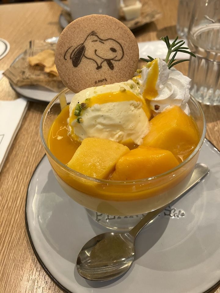 マンゴープリンは、濃厚なプリンの上にアイス、プリントクッキーがトッピングされたボリューミーなメニュー!