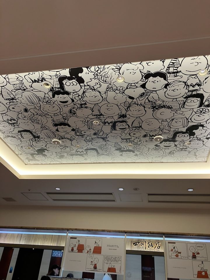 天井にもスヌーピーたちの絵柄が!どこを見てもキャラクターのイメージが楽しめる内装です