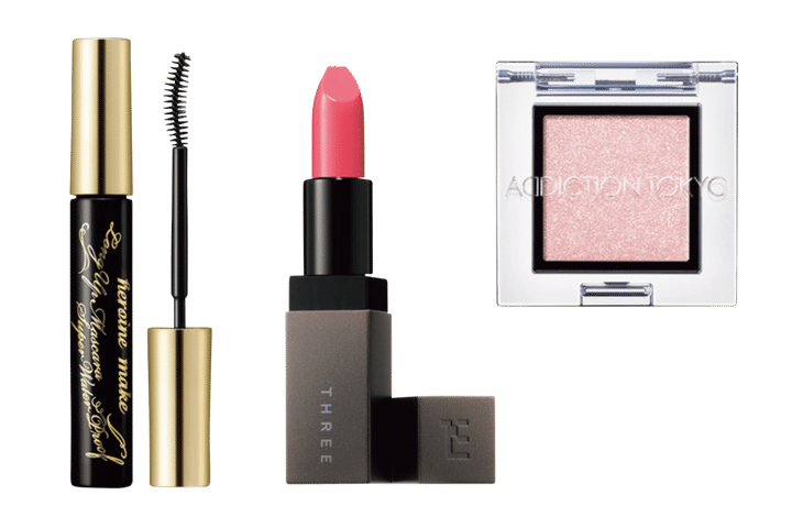 右から:ザ アイシャドウ パール 012P ¥2,200(アディクション ビューティ)、デアリングリィデミュアリップスティック 03 ¥4,290(THREE)、ヒロインメイク ロングUPマスカラ スーパーWP 01 ¥1,320(伊勢半)