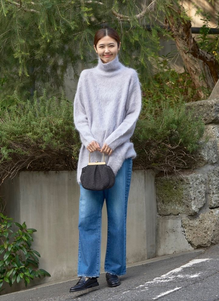 「今季気になっているチュニック丈のタートルネックニットを主役にコーディネート。毛足の長いシャギーニットには、デニムやローファーを合わせてトラッド感をプラスしました。ふんわりとした素材感&優しいカラーのニットなので、小物はブラックでまとめてモダンな雰囲気を意識しました」
