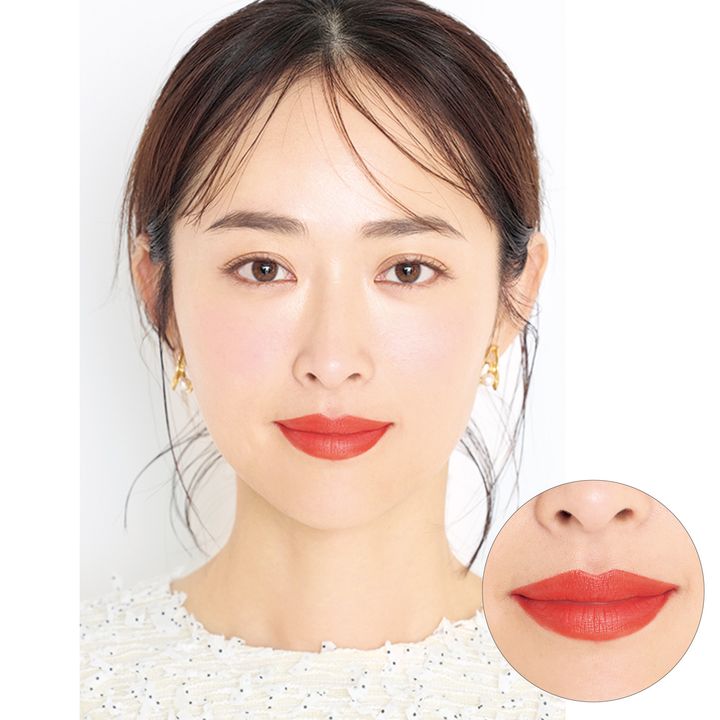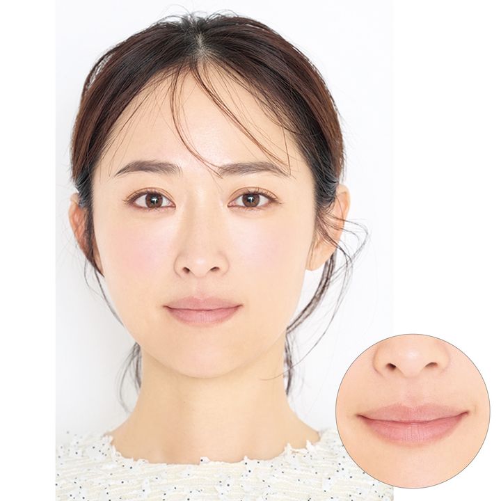 素の唇は主張が弱め。唇の山をくっきり作るとクールな印象ですが中顔面が長く。笑顔に見せつつエイジングケア効果も狙うなら、山は“なだらかにふっくら”が最適!