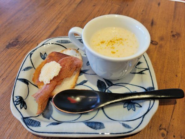 「季節の温かいすり流し」は、季節のお野菜で作った温かい一品です。お皿も素敵ですね。この木で出来た癒しのテーブルは、どのお皿にでも似合いそうです。