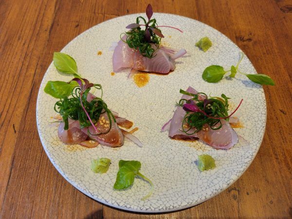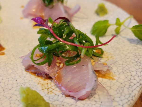 脂ののったかんぱち!ぷりっぷりよ~!長浜市場から空輸したかんぱちを使用。胡麻醤油を絡めた博多郷土料理のゴマかんぱちをサラダ仕立てにしてあります。