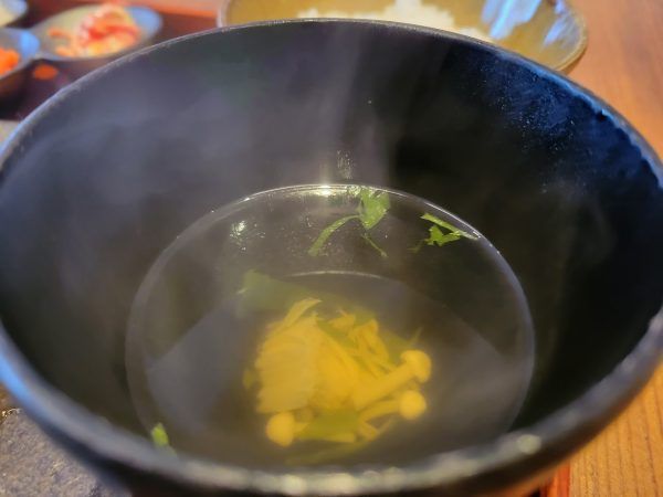 えのきと大葉のすまし汁 やさしい味わいのすまし汁です。お酒が少し入っているのでしょうか。体がポッと温まります。